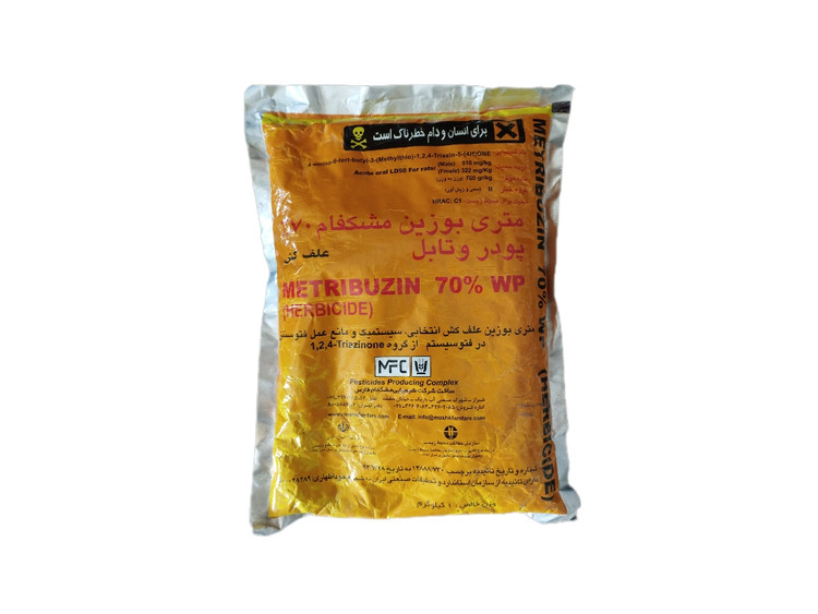متاسفانه این کالا در حال حاضر موجود نیست. میتوانید از طریق لیست بالای صفحه، از محصولات مشابه این کالا دیدن نمایید.متری بوزین (WP 70%) علف کش انتخابی و سیستمیک از گروه تریازینون ها میباشد که بازدارنده انتقال الکترون در فتوسیستم II در فرایند فتوسنتز می باشد. جذب از طریق ریشه و در مواردی توسط برگ ها و قابل انتقال در آوندهای چوبی می باشد. علائم تاثیر در گیاه به صورت کلروز سریع، نکروزه شدن از حاشیه برگ ها و در نهایت خشک شدن برگ ها می باشد. ماندگاری این علف کش در خاک 1 تا 2 ماه می باشد.